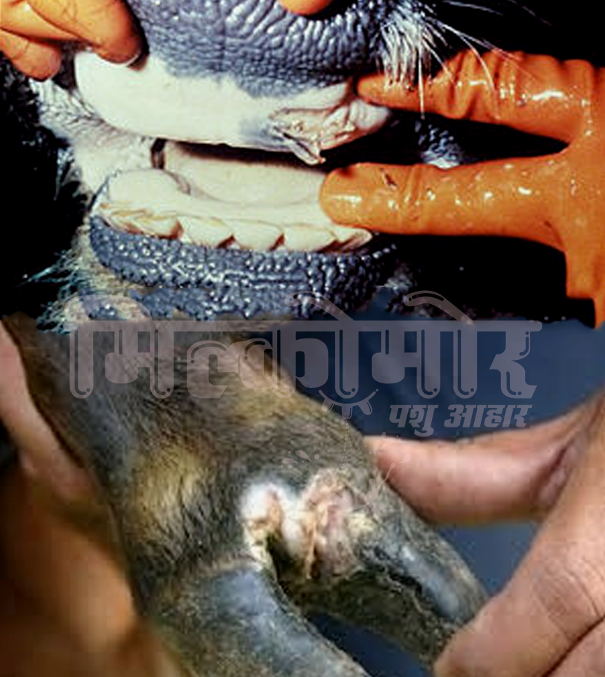 इस रोग के आने पर पशु को तेज बुखार हो जाता है। बीमार पशु के मुंह, मसूड़े, जीभ के ऊपर नीचे ओंठ के अन्दर का भाग खुरों के बीच की जगह पर छोटे-छोटे दाने से उभर आते हैं, फिर धीरे-धीरे ये दाने आपस में मिलकर बड़ा छाला बनाते हैं। समय पाकर यह छाले फल जाते हैं और उनमें जख्म हो जाता है। ऐसी स्थिति में पशु जुगाली करना बंद कर देता है। मुंह से तमाम लार गिरती है। पशु सुस्त पड़ जाते है। कुछ भी नहीं खाता-पीता है। खुर में जख्म होने की वजह से पशु लंगड़ाकर चलता है। पैरों के जख्मों में जब कीचड़ मिट्टी आदि लगती है तो उनमें कीड़े पड़ जाते हैं और उनमें बहुत दर्द होता है। पशु लंगड़ाने लगता है। दुधारू पशुओं में दूध का उत्पादन एकदम गिर जाता है। वे कमजोर होने लगते हैं। समय पाकर व इलाज होने पर यह छाले व जख्म भर जाते हैं परन्तु संकर पशुओं में यह रोग कभी-कभी मौत का कारण भी बन सकता है।चुचुक में छाले होने से थनेला हो सकता है । यह एक विषाणु जनित बीमारी है जो फटे खुर (Cloven Footed) वाले पशुओं को ग्रसित करती है। इसकी चपेट में सामान्यतः गो जाति, भैंस जाति, भेड़, बकरी एवं सूकर जाति के पशु आते है। यह छूत की बीमारी है।